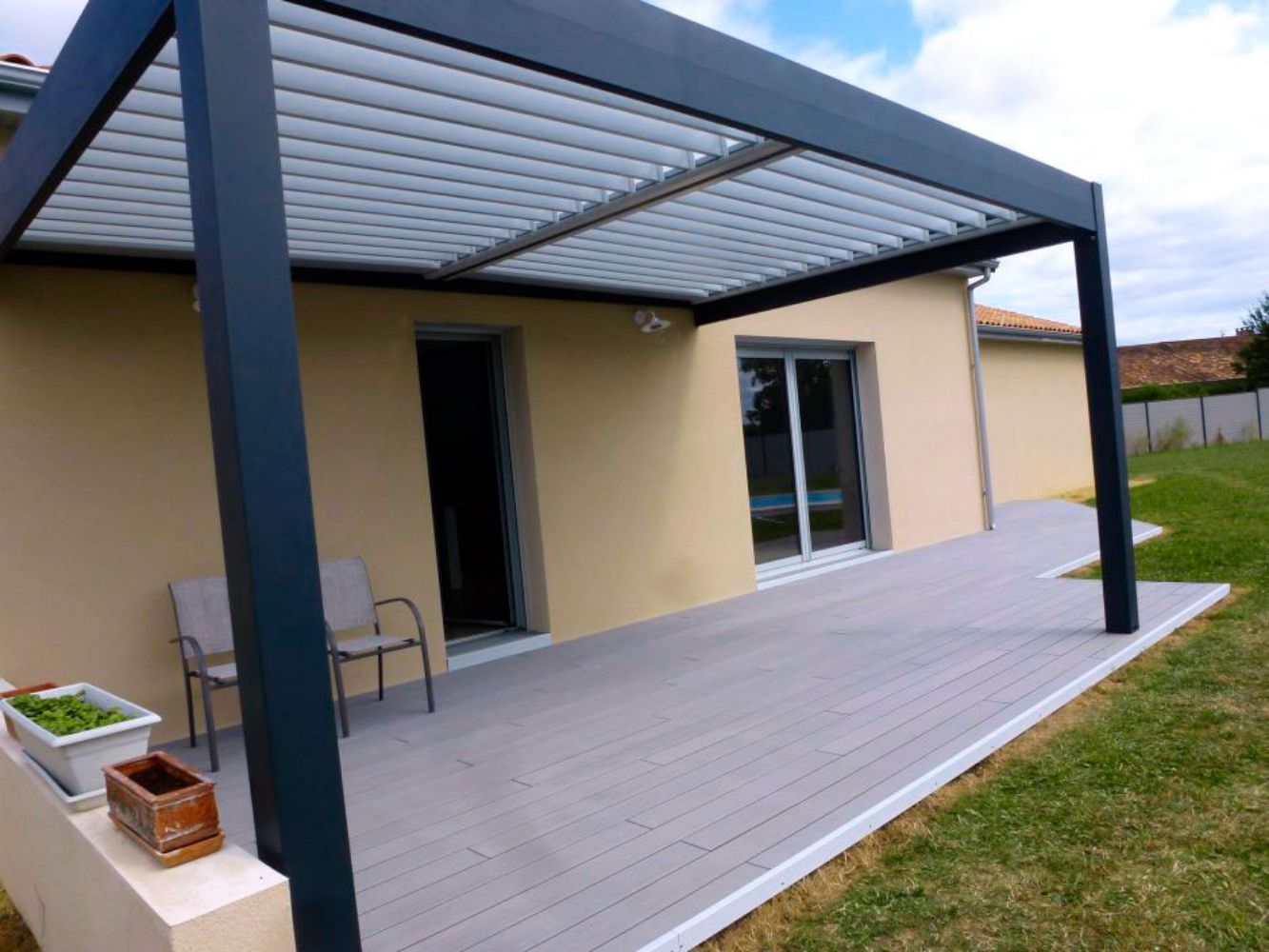 Portail, clôture, terrasse, store, pergola